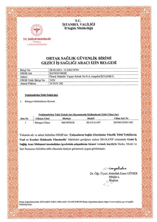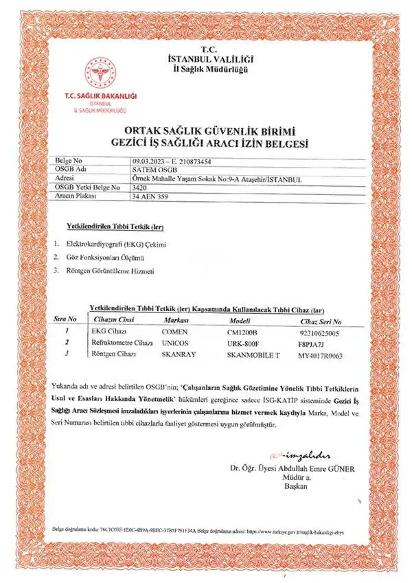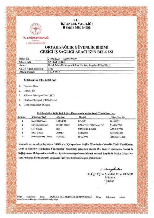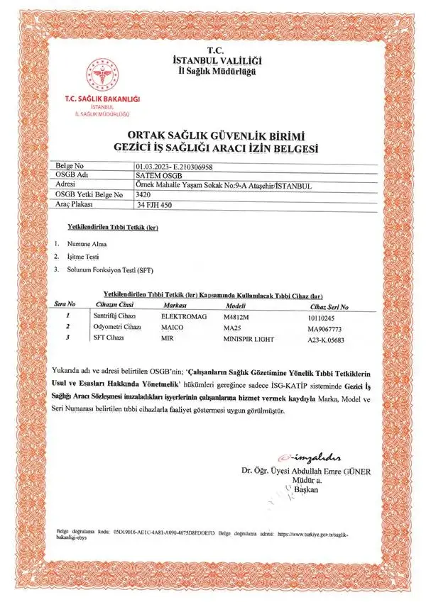 Gezici iş sağlığı araçlarımız, yetki belgeleriyle tam donanımlı olarak iş yerinize geliyor. SATEM GRUP olarak, sağlıklı ve güvenli çalışma ortamları yaratmak için her an yanınızdayız.