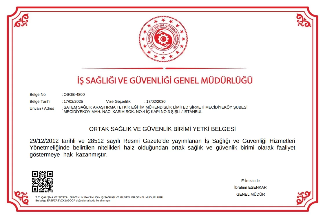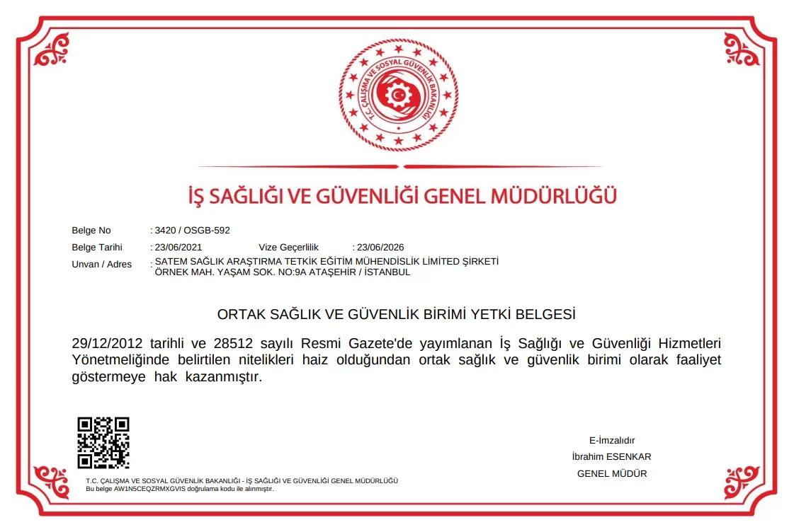 Satem Mobil Sağlık, Çalışma Bakanlığı onaylı yetki belgesine sahip bir OSGB'dir. İş sağlığı ve güvenliği hizmetlerinde yasal standartlara tam uyum sağlamaktayız.