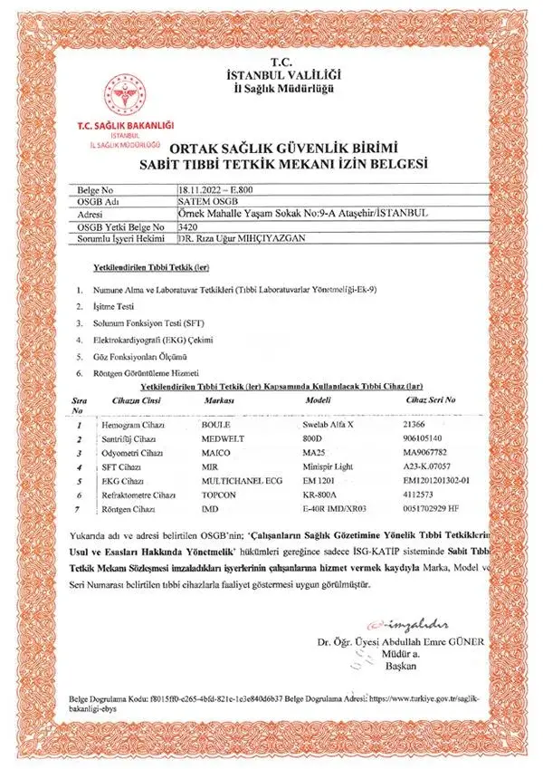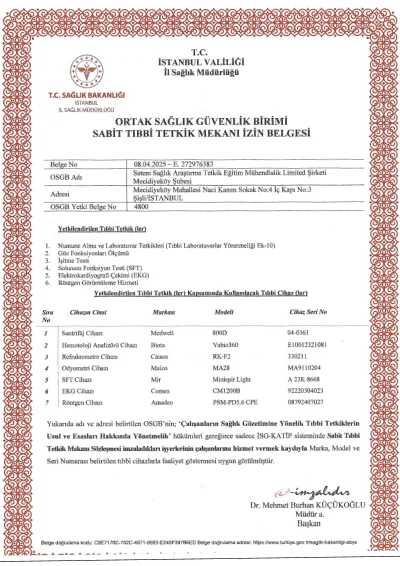 Sabit Tıbbi Tetkik Mekanı Yetki Belgemiz ile hizmet kalitemizi ve güvenilirliğimizi resmi olarak tescilledik. Sağlığınız için profesyonel ve standartlara uygun teşhis hizmeti sunuyoruz.